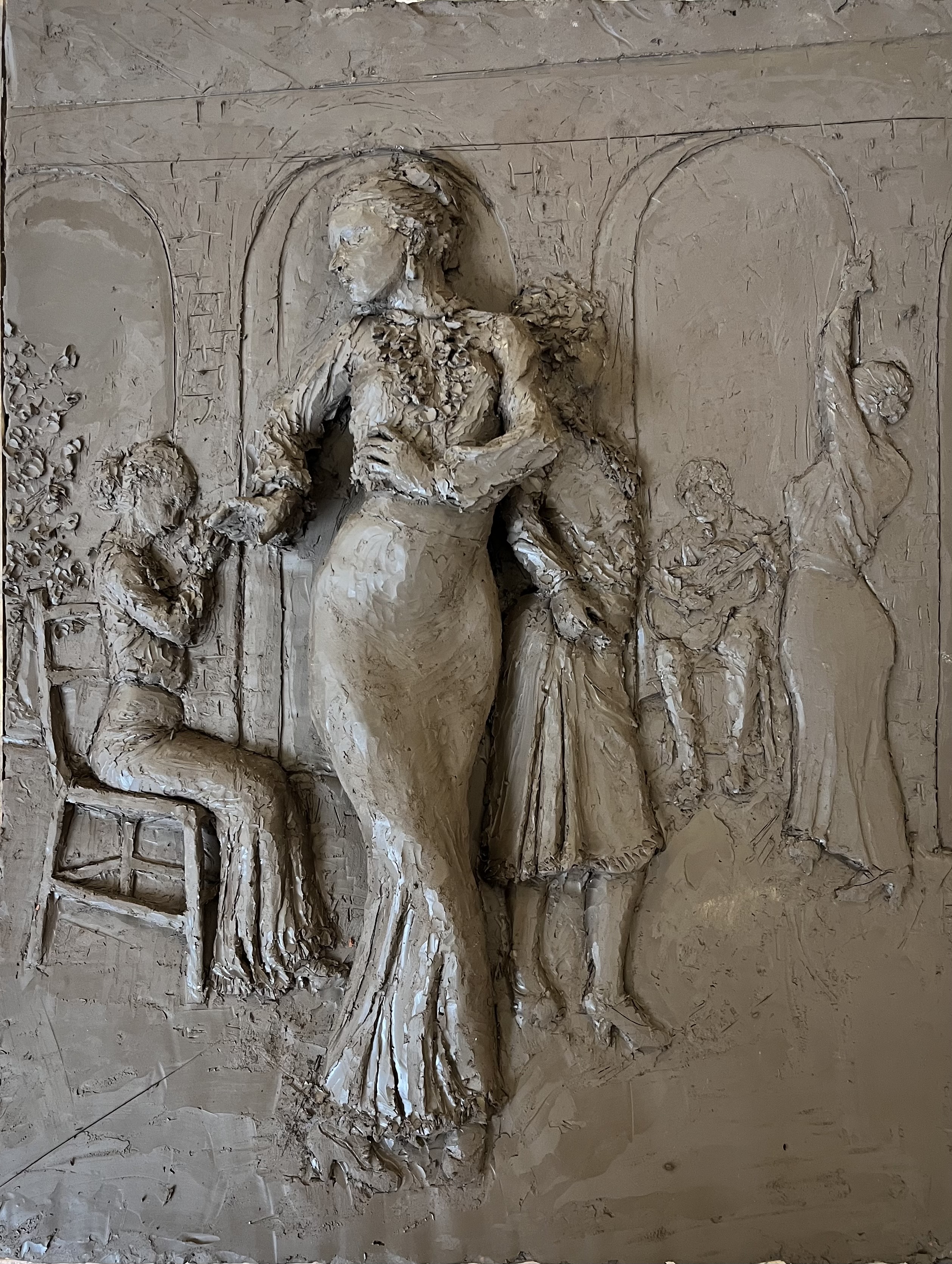 Haut relief représentant plusieurs danseuses de flamenco et un guitariste dans une salle voûtée