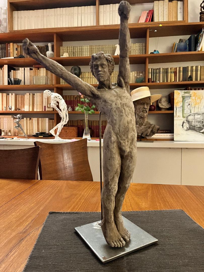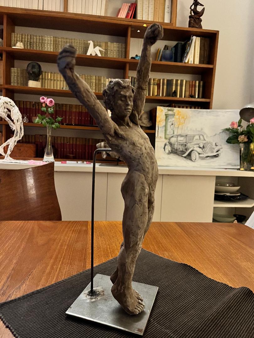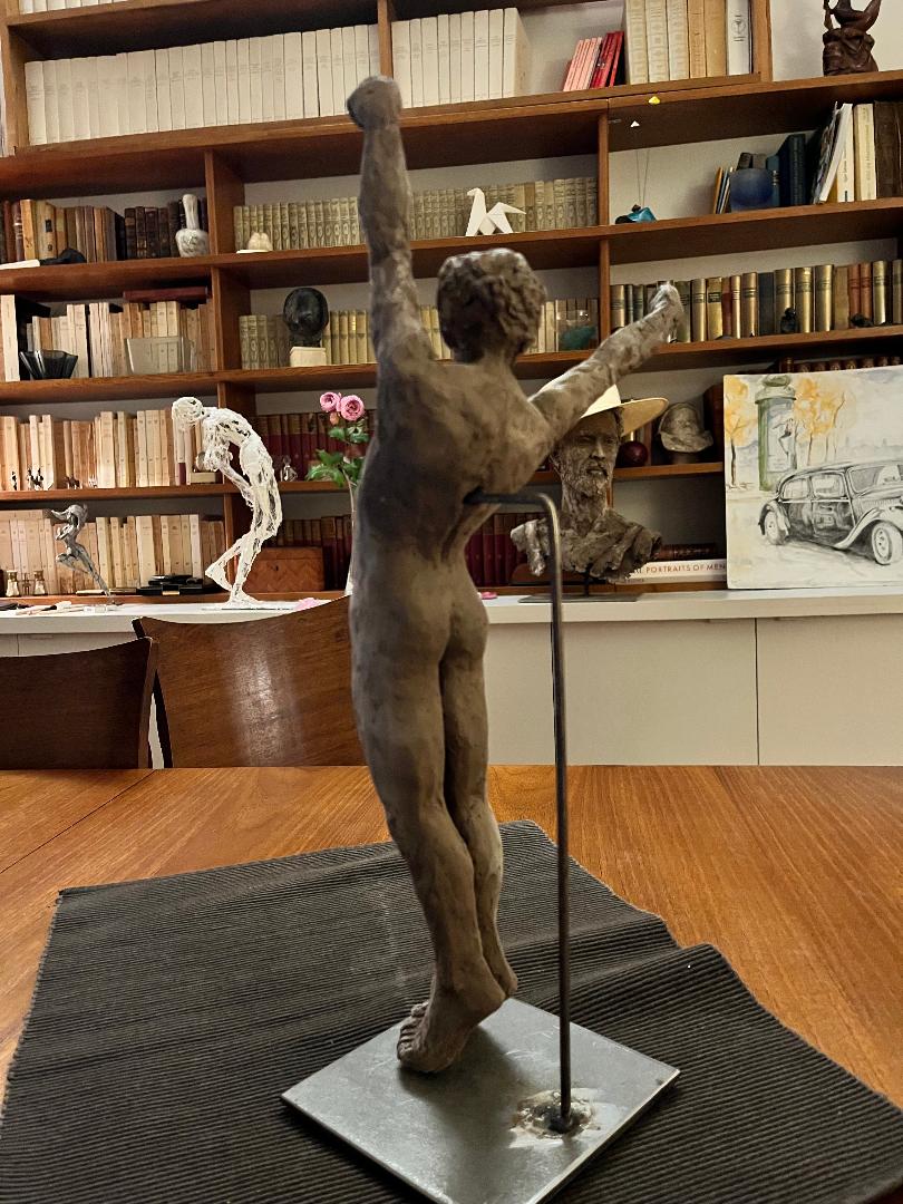 Terre cuite noire lisse, non patinée, montée sur une armature métallique et socle.
